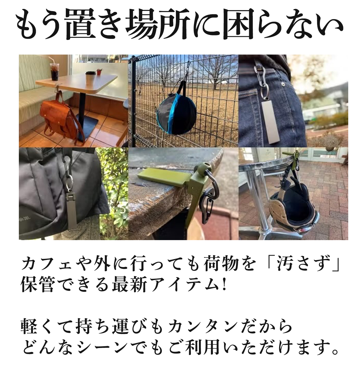 ・カフェ・居酒屋・レストラン・オフィス・学校・自宅・公園の金網・アウトドア・キャンプetc・・・カバンだけでなく、公園などに持ち歩く水筒や買い物袋
