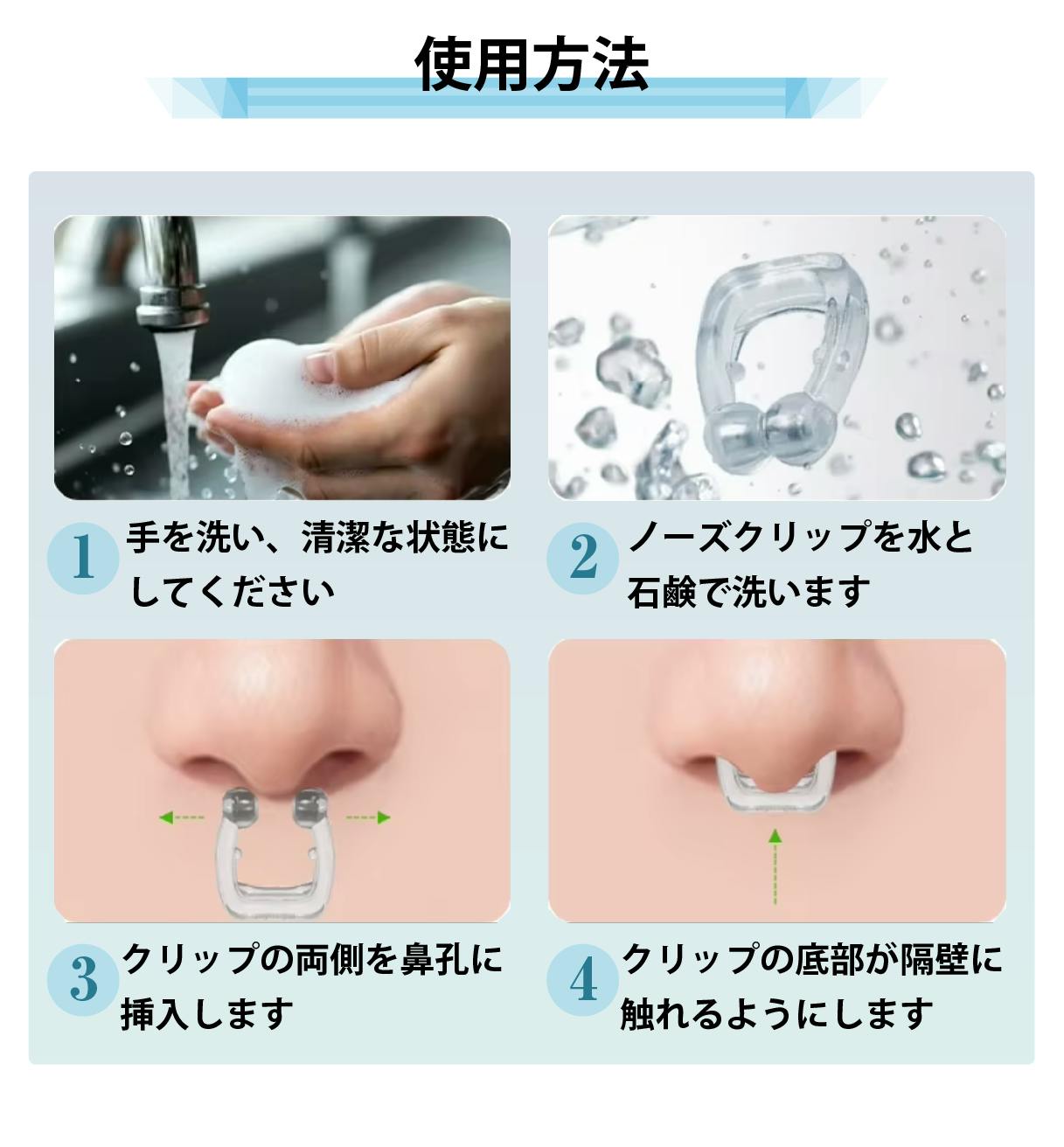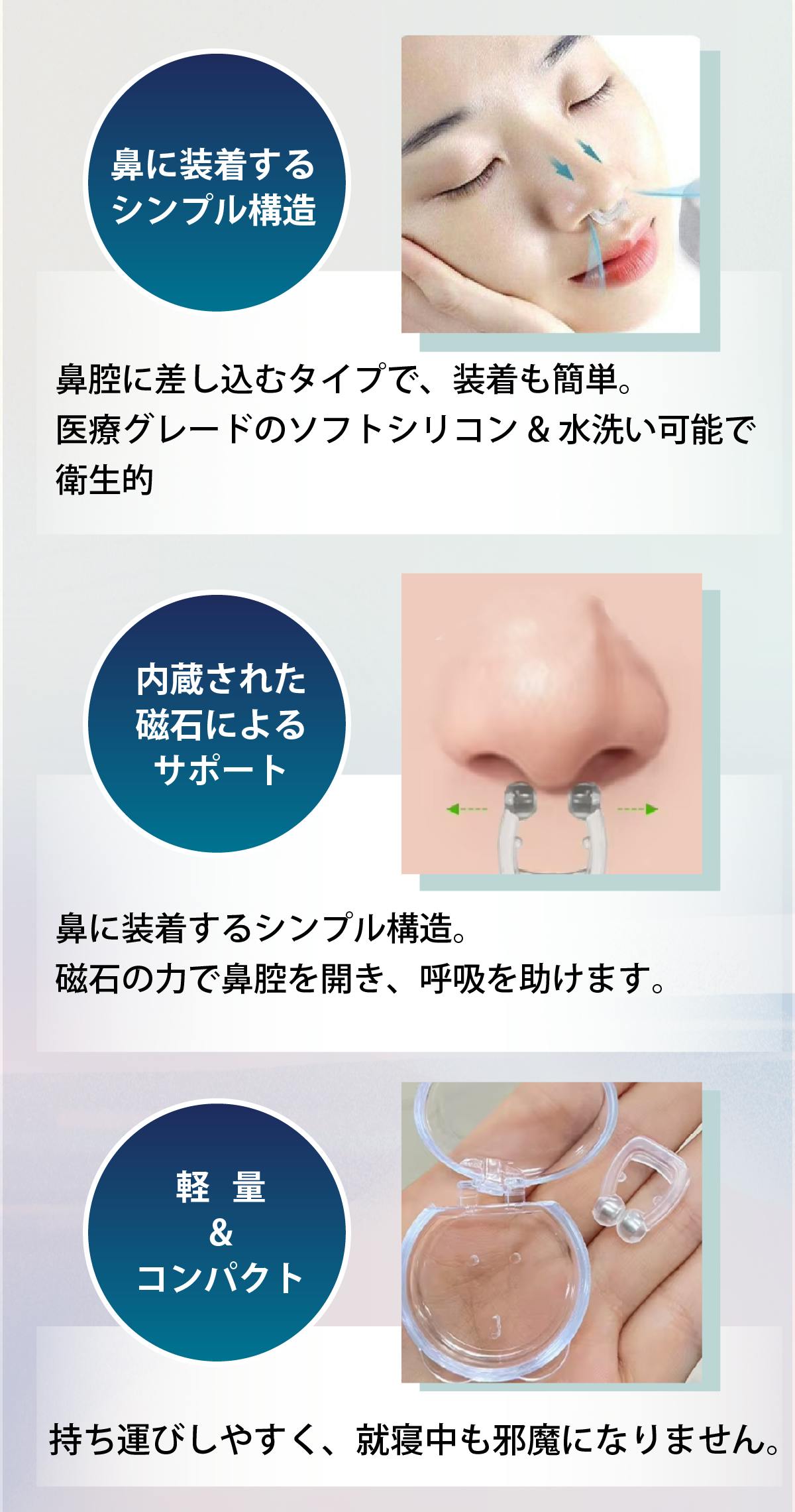 本体内部に磁石が内蔵されており、装着することで鼻腔を広げて通気性を改善し、呼吸をサポートします。
