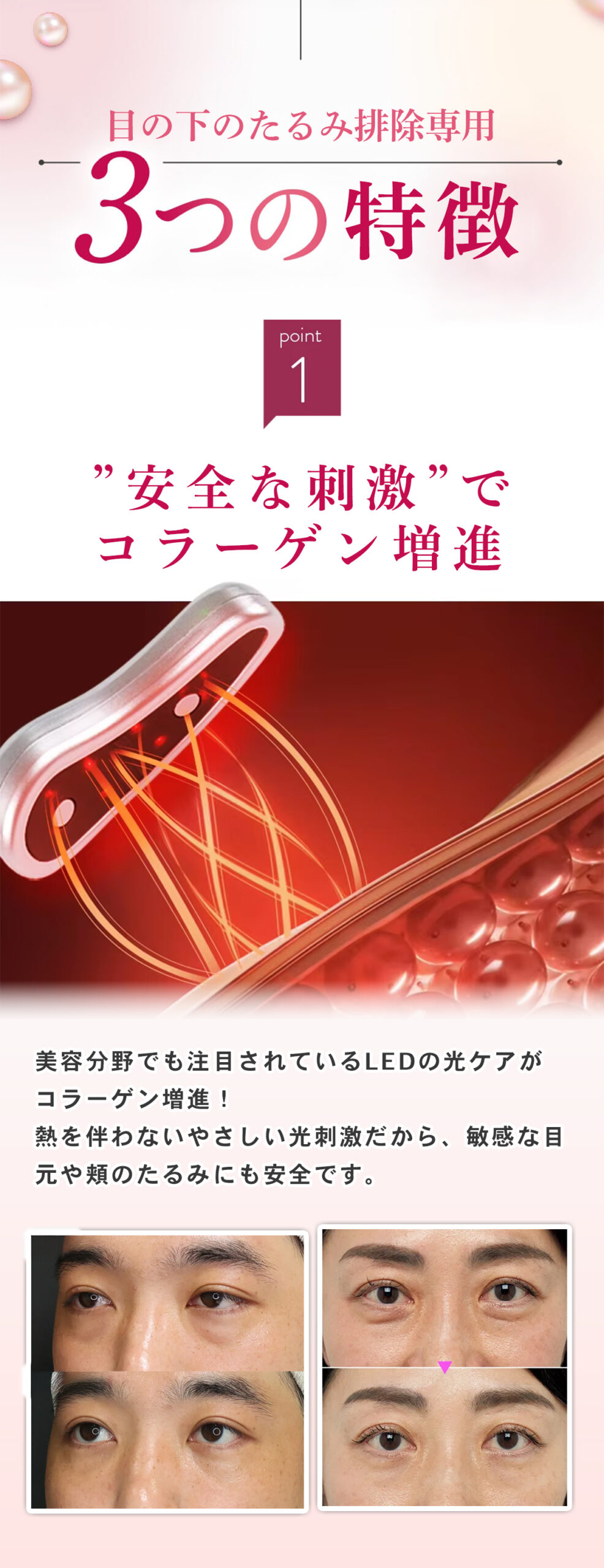 A. 肌にやさしい設計ですが、心配な方は低出力からスタートしてください。万が一、異常を感じた場合はすぐに使用を中止し、医師にご相談ください。