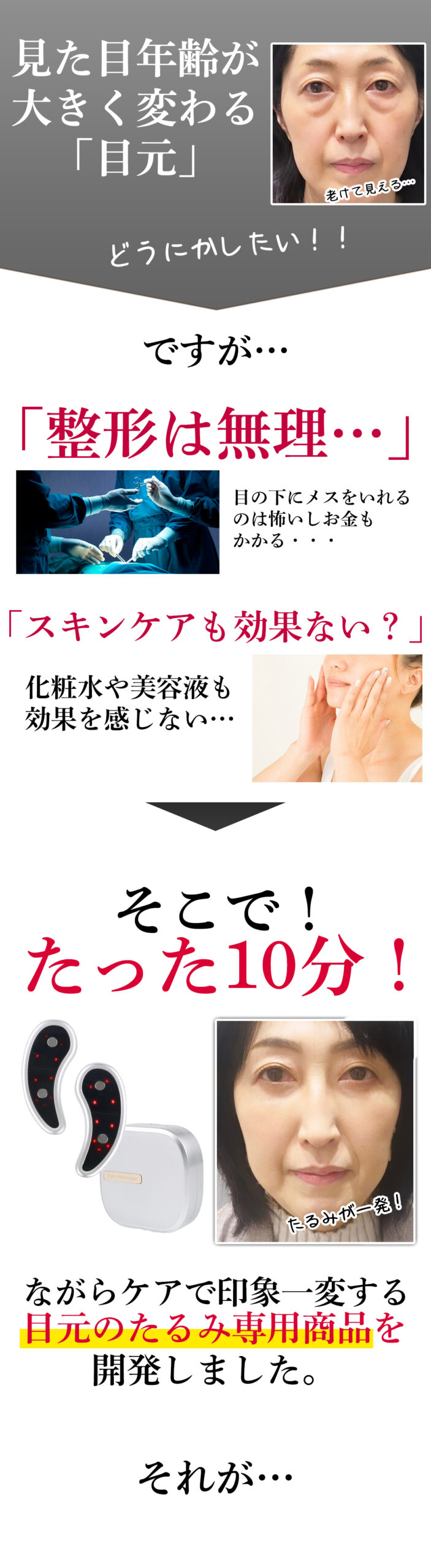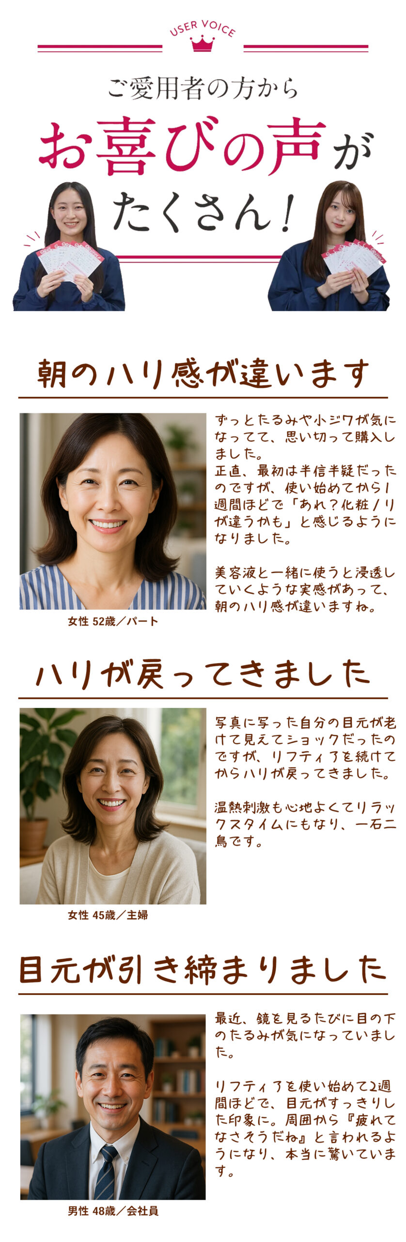 A. 個人差はありますが、1~2週間で目元のハリやすっきり感を実感される方が多いです。継続することで、たるみ感やクマ感が気にならない明るくいきいきとした印象づくりをサポートします。