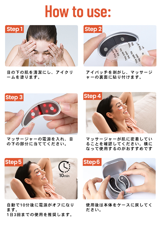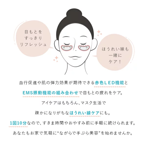 A. むしろ“面倒くさがり”な方こそおすすめです。スイッチを入れて目元に当てるだけ。道具も準備も不要で、ながらケアも可能です。習慣にしやすい設計です。