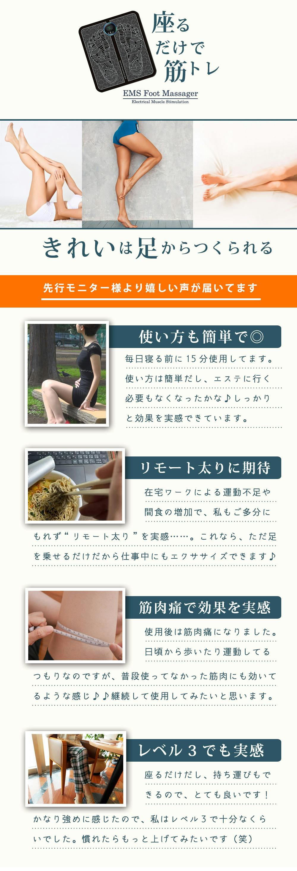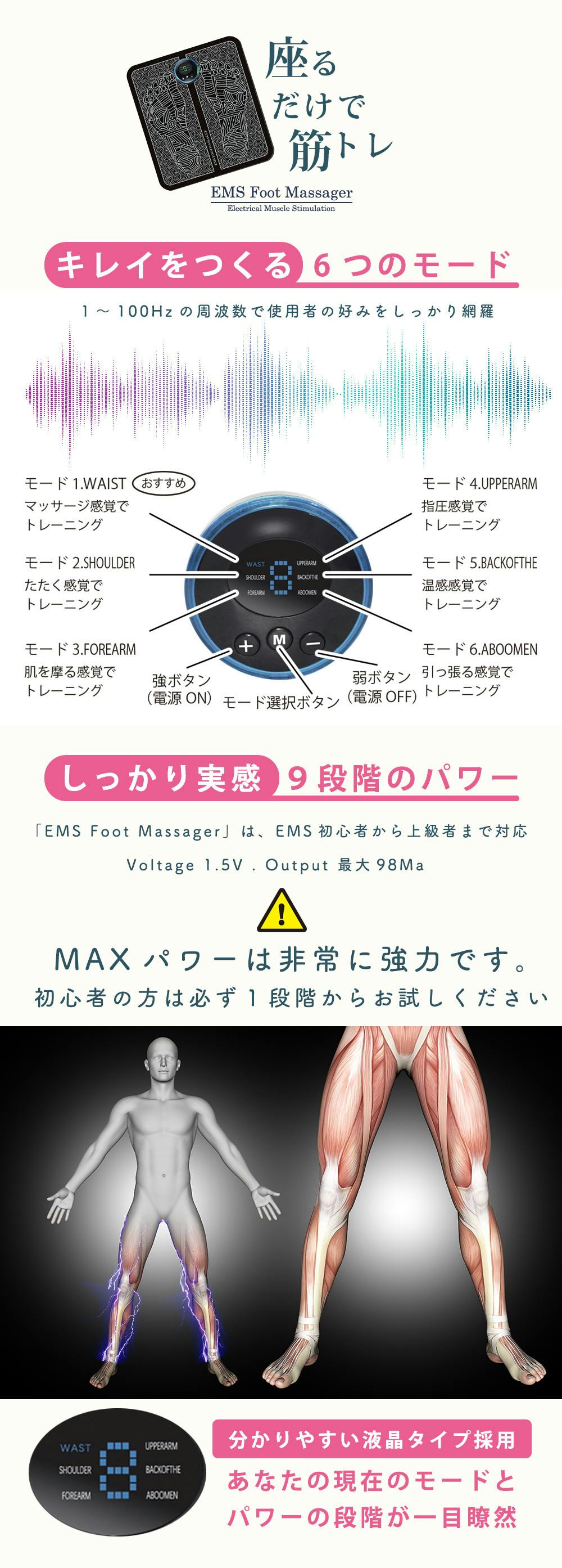 【使用上の注意】・心臓ペースメーカー等体内移植型医療電子機器、人工心肺等生命維持用医療電子機器、心電図スキャナー等着用型医療電子機器などの医療機器を使用している方、心臓に疾患をお持ちの方、妊娠・出産直後の女性はご利用をお控えください。その他、医療機関にて治療を受けている方は使用前にお医者様へご相談ください・飲酒中や、飲酒後の使用やお止めください。事故やケガの原因になります。・初めてご使用の際は、弱いモードから始め一段階ずつ上げてください。・充電しながらのご使用はおやめください。・使用中または使用後に痛みや不快感を感じたり、かゆみなどの異常がある場合、直ちに使用を中止し、医師に相談してください。・本製品を使用する時は、アクセサリー類を外してください。事故や怪我、破損の原因になります。むやみに刺激レベルを強くしたり、長時間使用すると、筋肉疲労や皮膚のヒリヒリ感、赤みの原因となります。・使用中に電子機器(腕時計、歩数計、携帯電話など)を本体に近づけないでください。電子機器が誤作動する恐れがあります。・本製品に水をかけたり、浴室などの湿気の多い場所、屋外などでは使用しないでください。感電や故障の原因になります。・コントローラーの電極部に金属を接触させないでください。・乳幼児や小さなお子様に本製品を使用させたり、遊ばせたりしないでください。・本製品の分解・改造は絶対しないでください。発火や事故、故障の原因になります。・商品を廃棄する場合は、お住まいの自治体の廃棄方法に従って捨てて下さい。
